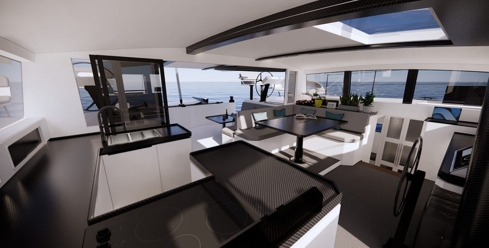 To feel the wind on your face you can open the windows, sail remotely from the forward cockpit or take the wheel in your hand on the aft deck. The living areas are bathed in natural light and windows and doors provide great visibility around the boat. The overall feel is warm and comfortable in a clean modern style that is practical and easy to maintain. Essentially, this space is insulated by the composite reinforced foam sandwich construction.