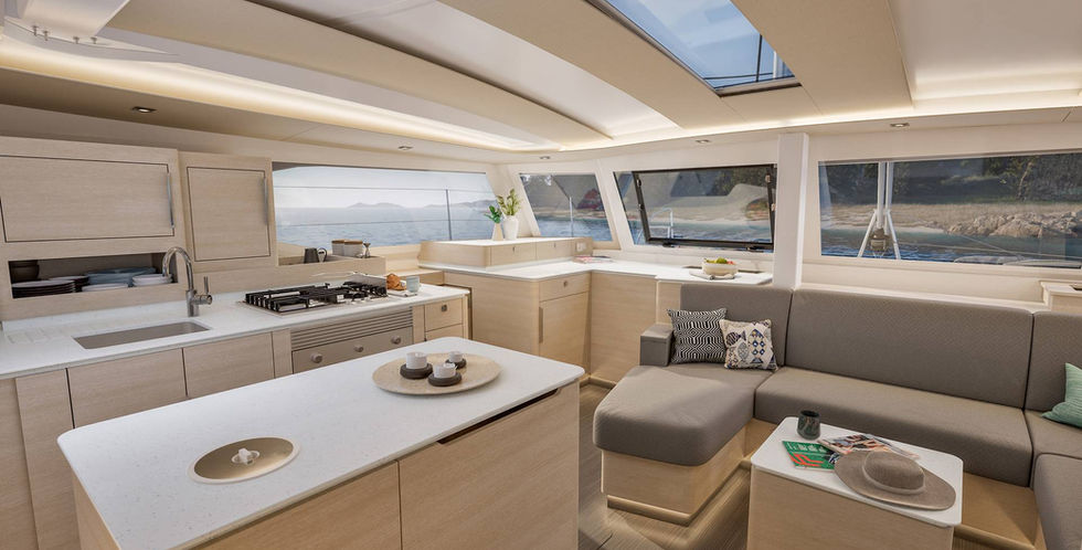 Living spaces aboard the New 44 are exceptional. The three-meter opening between the saloon and aft cockpit creates a seamless indoor-outdoor experience, while the central island in the galley offers both functionality and socializing opportunities. The lounge deck accommodates up to eight people with additional sunbathing areas, making it the largest Fountaine Pajot has ever designed for this class.