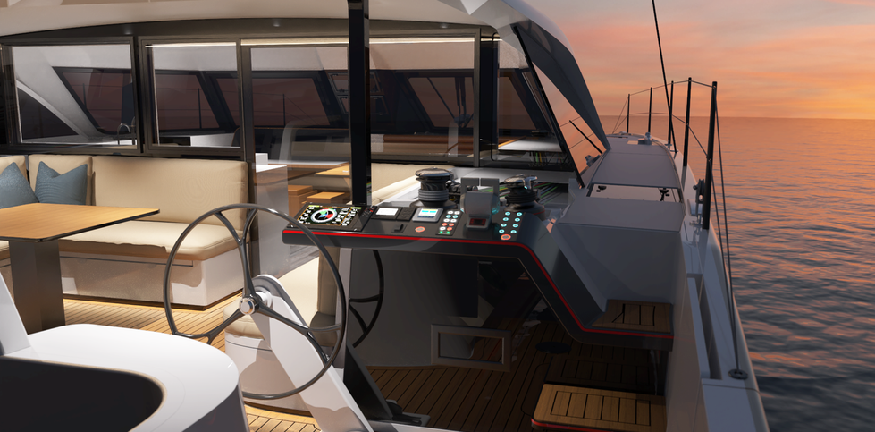 For the technology shy, traditional standalone diesel engines with shaft drives are also offered. Folding transoms enhance safety at sea, and open while at anchor to increase living space and provide an easy connection with the water. Helms rotate in and out for protection, visibility, and an enhanced sailing experience. Safety being paramount, uncluttered side decks and folding transoms provide a completely enclosed cockpit making the boat more child and pet friendly. All deck hatches are mounted flush, lines and linedrivers are cleverly housed under deck. A continuous, unbroken toe rail runs the length of the hull deck with all joints finished and hidden. The angular cabin allows the two large, forward facing windows to open fully from inside the generously sized (187 sq ft or 17.4m2) salon. Comfort underfoot has been enhanced with non-skid EVA foam decking standard. An optional self-tacking Staysail (Jib) and asymmetrical foresail (J1, Reacher, Gennaker) sit on a custom engineered longeron. Large, double hinged sail lockers span the width of the hull to allow easy access to sail storage and toys. Steer the boat from the outboard position with the wind in your hair with increased visibility of your sail plan. A fold down helm seat stows out of the way for everyday living and easily deploys when needed. Rotate the helms inboard and steer from the protection of the three-seat sofa on the aft beam.
