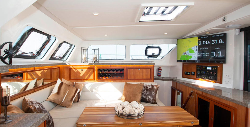 Royal Cape Catamaran’s stylish new Majestic 570 features modern lines with an exciting, fresh new look. There are benefits to functionality, safety and performance. Increased freeboard, larger windows with more natural light and visibility. A longer waterline length enhances performance and increases buoyancy. The 570 also offers larger trampolines and more sail area. The cockpit is a great alfresco dining area with ample seating, perfect for entertaining and relaxing. The skipper has good all round visibility and arm’s length control from a well protected helm position. There are superb drop-side curtains offering protection from the elements. The cockpit can accommodate various appliances, such as the washer dryer and additional fridge/freezer. The elegant interior of the Majestic 570 is also enhanced with more space, comfort and functionality in the salon, galley, cockpit and cabins. Customers have the choice of various interior finishes with Royal Cape Catamaran’s impeccable craftsmanship. Layout options include 4, 5, or 6 superbly appointed staterooms with dry heads, separate showers and superior ventilation.