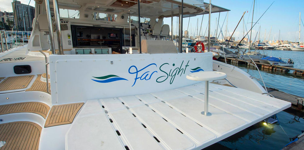 The Majestic 570 is extremely well equipped with top quality appliances, communication and navigation systems. Superior battery, water and fuel capacity, plus extendable solar panels are ideal for long range voyagers. The unique dive/fish/BBQ station is a popular feature and offers a large storage area for wet gear. The dive platform doubles as a tender lift. he impressive owner suite with an adjoining study utilizes the entire forward half of the starboard hull. The spacious designed layout includes a raised king size berth with custom pillow top mattress, leather headboard, storage cupboards, spacious hanging lockers, as well as two double lockers. Beautiful custom shelving flank the sides of the bed. USB plugs, an entertainment center with TV, DVD/CD player gives this master suite a luxury plus.