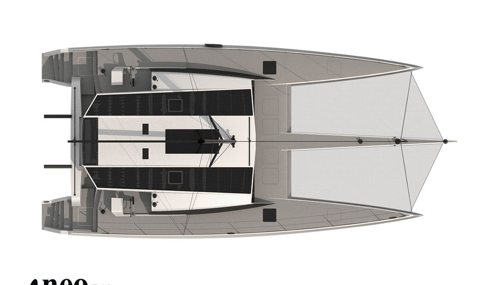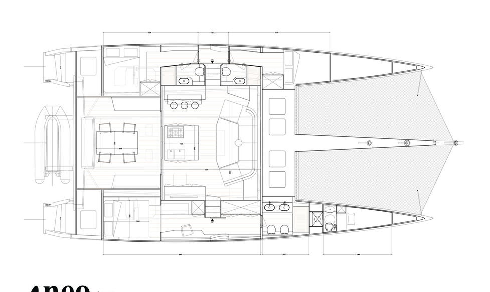 The layout provides that the entire starboard hull of the catamaran is dedicated to the owner's accommodation. In place of the large walk-in
